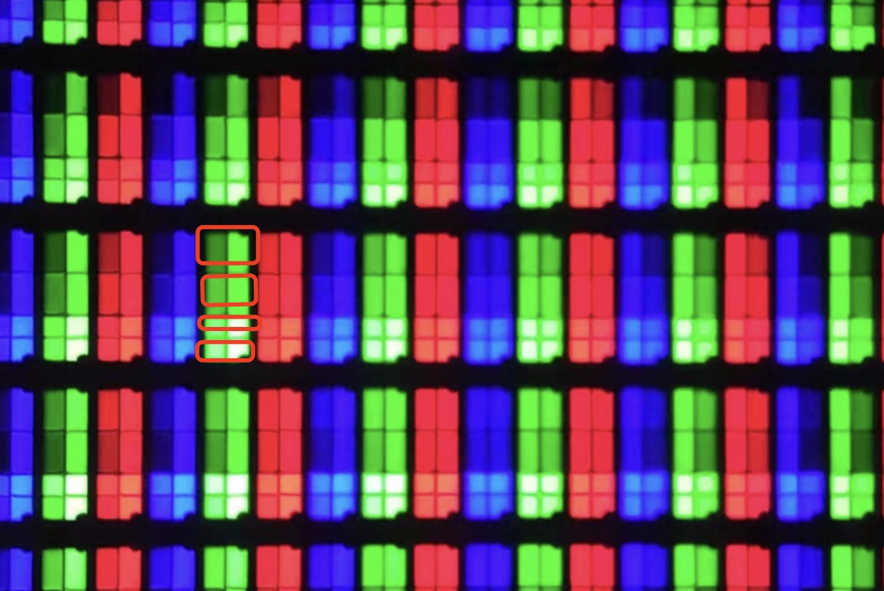 雙 HDMI 2.1 插口支持 4K 120Hz 的畫面輸出,這方面官方表示 G1 系列電視是真正的滿血帶寬,在插上電腦、進入顯示器模式進行分辨率測試時(此時 HDR 和 VRR 關閉),用一臺 Find X3 Pro 也可以放大看清像素狀態,這種被切分為8個單元的像素排列自然是應用在更高一級的面板工藝上,當然成本也更高。