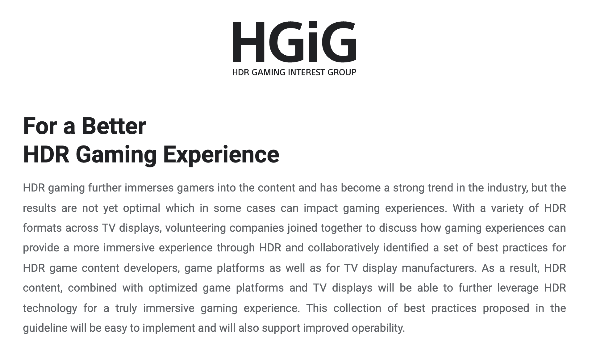 這次又學了個新詞兒,HGiG 全稱為 HDR Gaming Interest Group,其為多家硬件、軟件公司聯合成立的聯盟組織,旨在為遊戲中的 HDR 制定指導方針保證其有更好的顯示效果,其由微軟和索尼發起並創建,成員包括 LG、三星和松下等電視製造商,以及動視、EA、Rockstar 和育碧等遊戲公司。